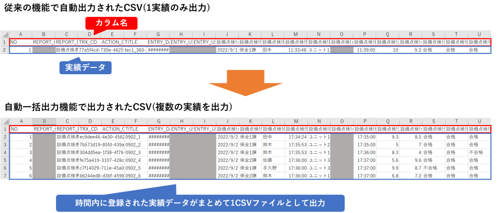 自動一括出力されたCSVファイルでは、複数行データがあることが分かります。このように、これまでは複数のファイルに出力されていた実績データを1ファイルにまとめることができるようになったため、従来の自動出力機能と比較して他のシステムへのインポートが容易になりました。もちろん出力する項目の絞り込み、出力項目名の変更もこれまで通り行えます。
