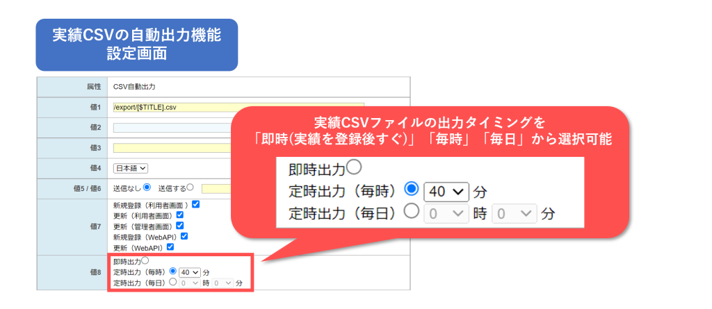 本機能の設定は、XC-Gate.V3の管理者画面(データ管理や各種設定を行う管理者ユーザー用の画面)で行うことができます。従来通り実績登録時にCSVファイルをすぐ出力したい場合は「即時」を、決まった時刻に実績をまとめて出力したい場合は「毎時」や「毎日」を選択すると出力タイミングの設定が反映されるようになります。
