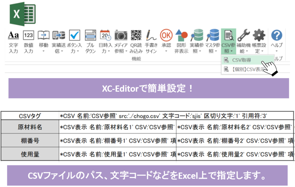 XC-Gate.V3と同時リリースの、帳票作成サポートアドインツール「XC-Editor(エクシーエディター)」にもCSVタグを設定する機能が実装されておりますので、画面上の項目を選んでいくだけで設定が可能です!