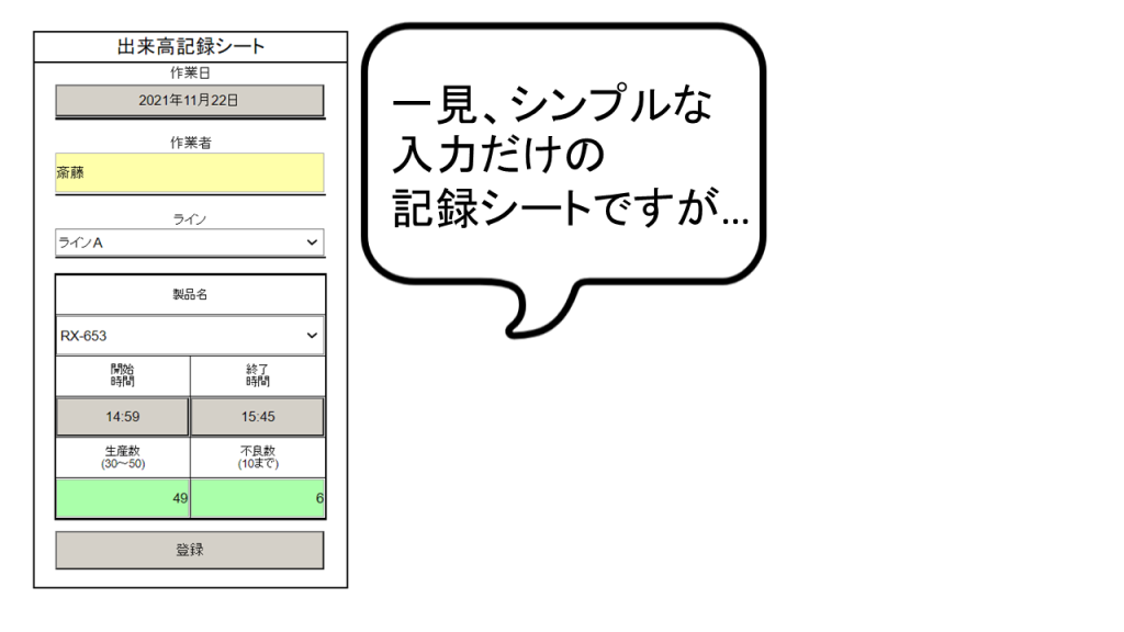 製品名を選択・入力すると作業開始時間に自動的に時刻が入力され、最後の項目の不良数を入力すると作業終了時間も自動的に時刻が入力されるようになっており、正確な作業時間を収集できます。また、作業者の方がわざわざ時刻を入力するという手間も減らせます。