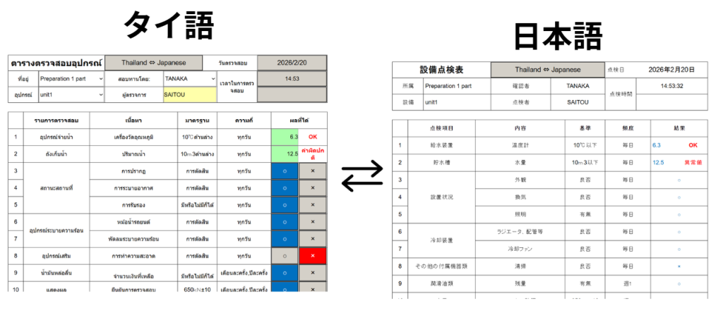 この仕組であれば、現地の方はタイ語帳票で入力し、日本の管理者は日本語帳票で確認するという運用が出来ます。