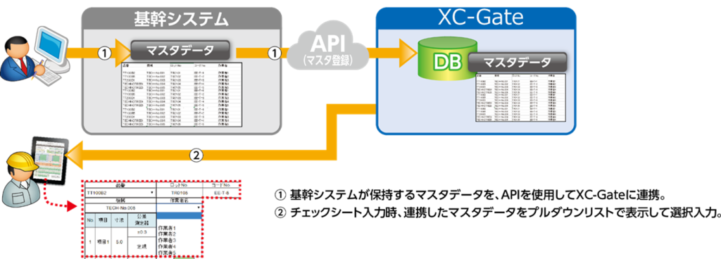基幹システムで管理しているマスタデータを、システム管理者がXC-GateのWebAPIを活用して、XC-Gateに自動で取り込む仕組みを構築(システム開発)することで、”生産計画情報”や”品名”などの現場情報のリアル連携が可能となり、それまでのデータ入力の工数が削減され業務効率化も行えた。