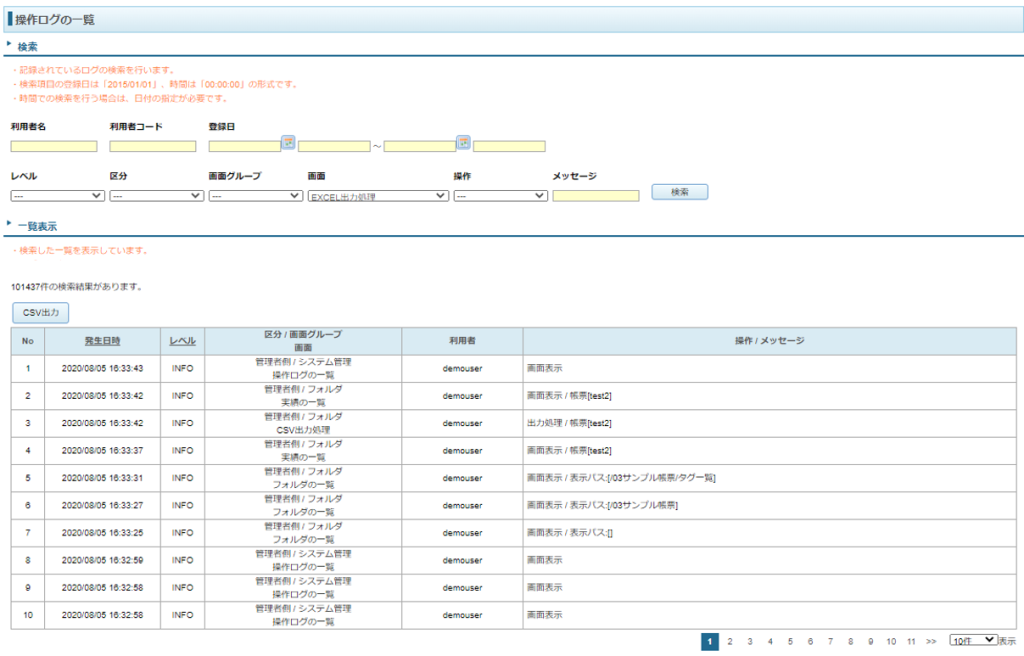 確認できる操作内容は、操作日時、ログレベル、管理者側の操作/利用者側の操作の区分、ユーザ、ユーザが行った操作内容などです。