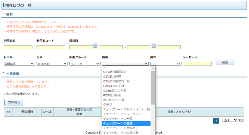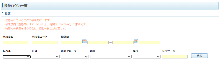 また、ユーザ単位での検索や、操作期間で検索を行うことができます。