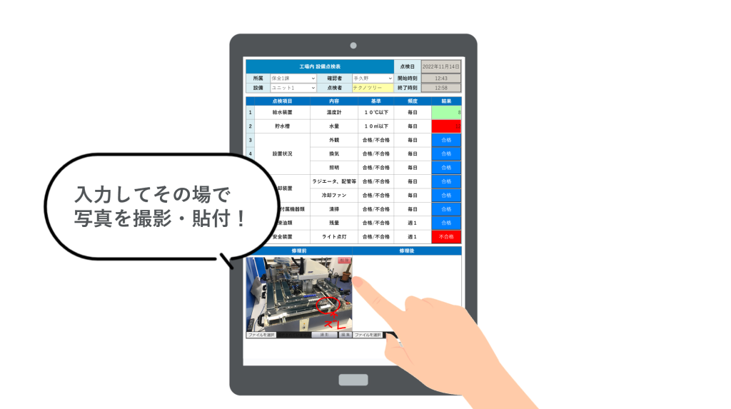 電子帳票に写真を貼付する運用のメリットとしては、製造品のエビデンスとして生産日報、作業日報に入力情報にプラスで写真を登録しておくことで、品質の保証に貢献します。