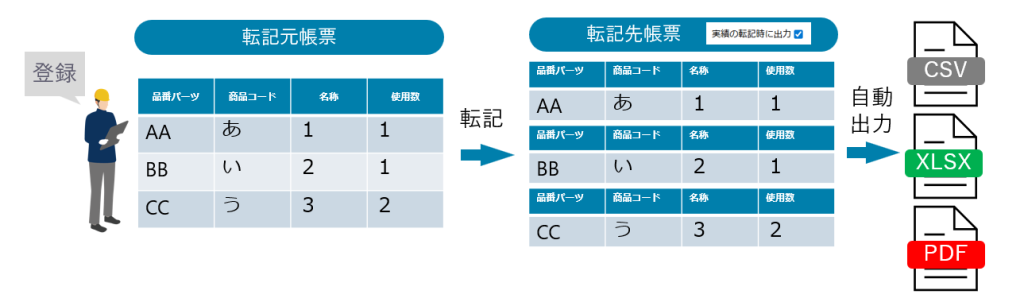 実績を登録したタイミングで他の帳票へ、入力した値を自動で転記できる機能です。一部のデータだけを別帳票に転記したり、データ加工がしやすいように分割して転記(データを縦型に成形)したりすることができます。