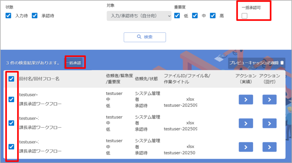 回付バインダに一括承認可の検索条件が追加され、一括承認可能な承認依頼を絞り込むことでチェックボックスで選択してまとめて承認ができるようになります。