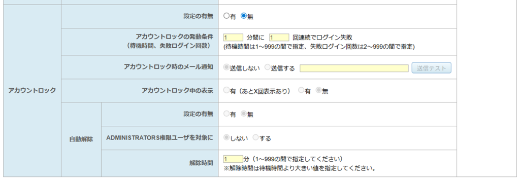 「システム管理※」→「各種設定」に「アカウントロック」を追加しました。設定画面で指定した条件でログインに失敗すると、正しいパスワードを入力してもアカウントが利用できないよう制限する機能です。これにより、不正アクセスを防止し、アカウントの安全性を高められます。