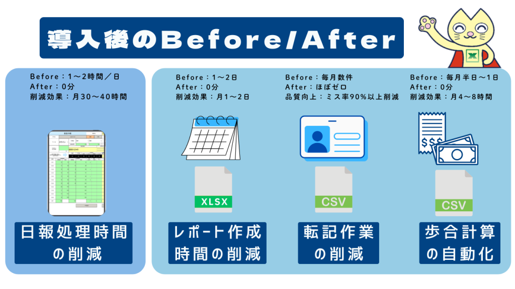 こうした業務は一見すると日常的な作業ですが、積み重なることで大きな工数とミスの温床になっています。「仕方ない」と思われがちなこの業務こそ、見直すべきポイントです。