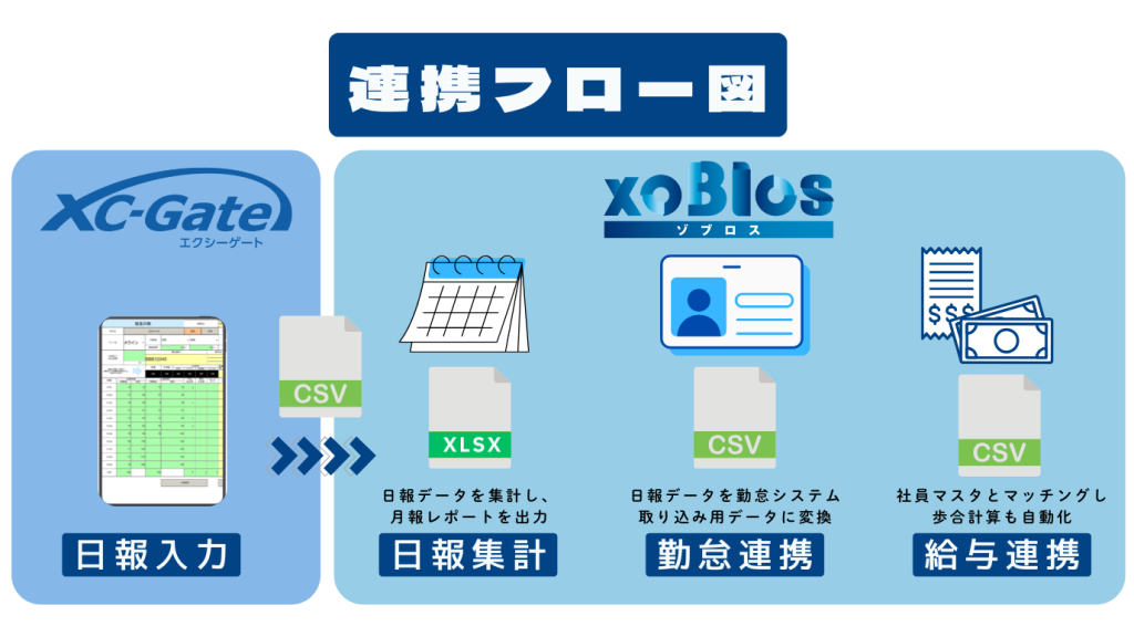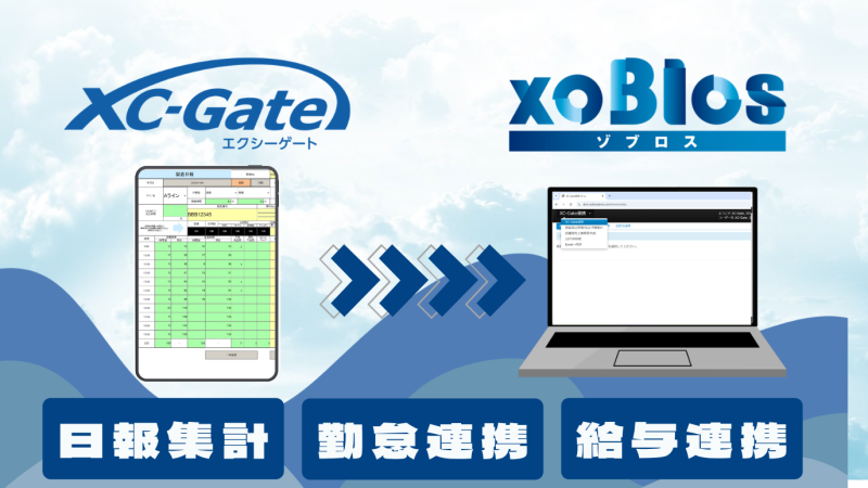 現場帳票電子化ソリューション「XC-Gate(エクシーゲート)」を利用して日報を電子化し、「xoBlos(ゾブロス)」との連携させることで、スマートフォン・タブレットから日報・作業報告をいつでもどこでも入力できる環境を実現します。さらに、「xoBlos」と連携することで日報データの集計、勤怠・給与システムへのデータ加工までを実現し、ミスの削減・業務効率化に貢献します。