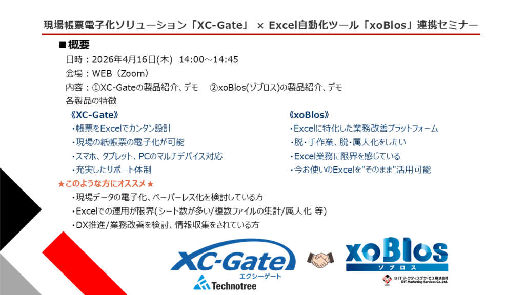 本記事では、「XC-Gate」で入力したデータを「xoBlos」でデータを自動加工することによるメリットをご紹介いたします。また、今回の連携に関してWEBセミナーを開催いたします!DITマーケティングサービス様のお問い合わせフォームに「セミナー」とご選択いただき、ぜひお申込みくださいませ。