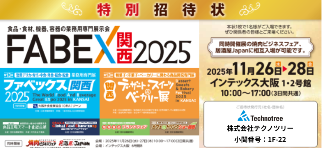 このたび、テクノツリーでは2025年11月26日~28日にインテックス大阪で開催される「FABEX関西」内「食品工場スマート化総合展」に出展します。