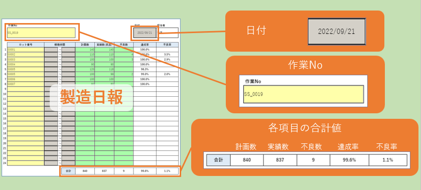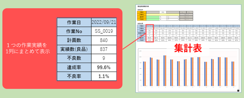 集計表には検索エリアがあり、期間、作業NO(完全一致)、達成率、不良率で絞り込みがかけられます。